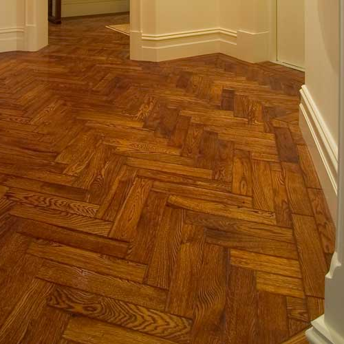 Oak parquet can be installed in a variety of patterns, from classic herringbone to complex geometric shapes. Such floors are coated with varnish or oil after installation.